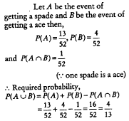 85. From a pack of 52 playing cards a card is drawn at random. What is the probability that the card is a spade or an ace?