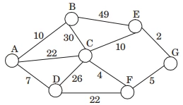 37. Consider the undirected graph below: Using Prim's algorithm to construct a minimum spanning tree starting with node A, which one of the following sequences of edges represents a possible order in which the edges would be added to construct the minimum spanning tree?