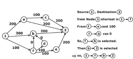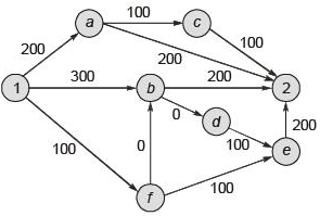 1. There are multiple routes to reach from node 1 to node 2, as shown in the network. The cost of the travel on an edge between nodes is given in rupees. Nodes ‘a’, ‘b’, ‘c’, ‘d’, ‘e’, and ‘f’ are toll booths. The toll price at toll booths marked ‘a’ and ‘e’ is Rs. 200, Rs. 100 for the other toll booths. Which is the cheapest route from node 1 to 2?
