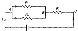 81. Three resistances R1 = 4 Ω, R2 = 8 Ω and R3 = 2 Ω are connected in a circuit carrying a total current I, as shown in the figure. If the current through the resistance R1 = 4 Ω is 1.2 A, then the potential difference across the resistance R3 is (NTSE Odisha, Stage-I, 2015-16)