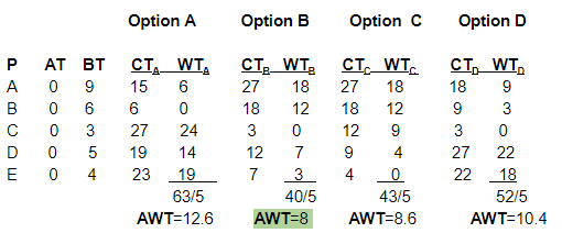 We will solve it by minimizing the avg Waiting Time and Take x = 4 BT = Burst or Execution time CT = completion time P = Process AWT = Average Waiting Time AT = Arrival time WT = Waiting time