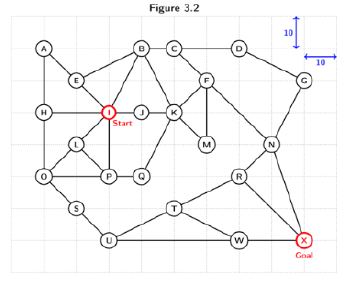 Figure 3.2 depicts a search space in which the nodes are labeled with uppercase alphabets: A,B,C,… . Here, node I is the start node and node X is the goal node. The nodes are laid out on a grid where each square is of size 10 x 10 units.